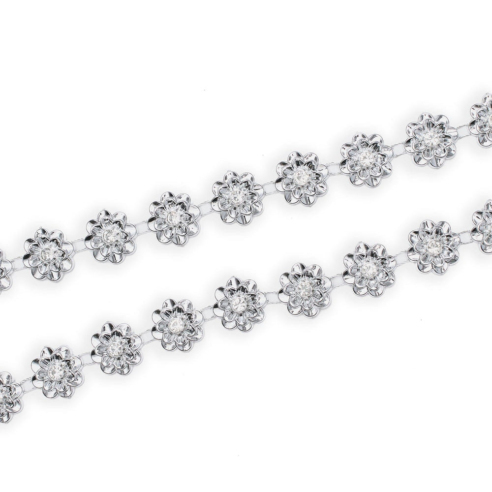 7/8 Inch Wildflower Metallic Rhinestone Trim is a shiny, lightweight decorative trim that features intricate floral ornaments, each accented with a sparkling rhinestone at the center. Made from polyester, plastic, acrylic, and resin components, each flower is securely attached to two parallel polyester threads with a 1/8-inch space between motifs. This trim measures 5/8 inches in design height, is 3.75 mm thick, includes a 7/8-inch horizontal repeat along the lengthwise grain, and weighs approximately 8.7 ounces per 10-yard spool.